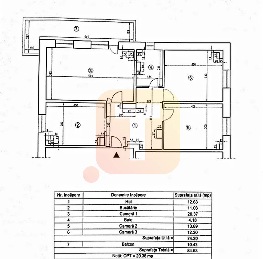 Apartament 3 camere Piatra Neamț Bulevardul Traian, decomandat, cu suprafață utilă de 84,63 mp (74,20 mp + balcon 10,43 mp) și suprafață construită de 92,33 mp, situat la etajul 4/4 al unui bloc construit în 1989, acoperit, fără lift.