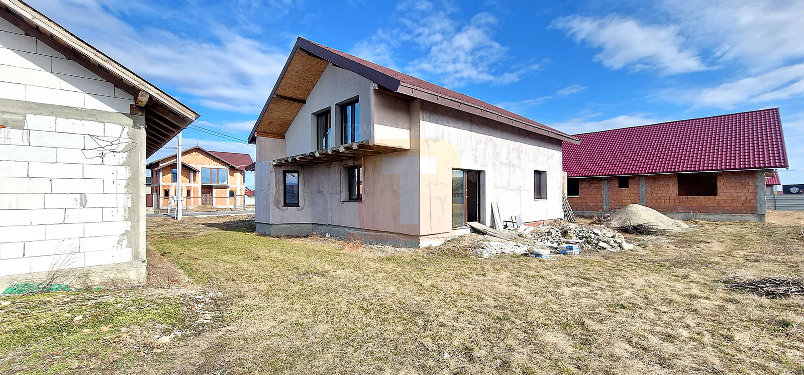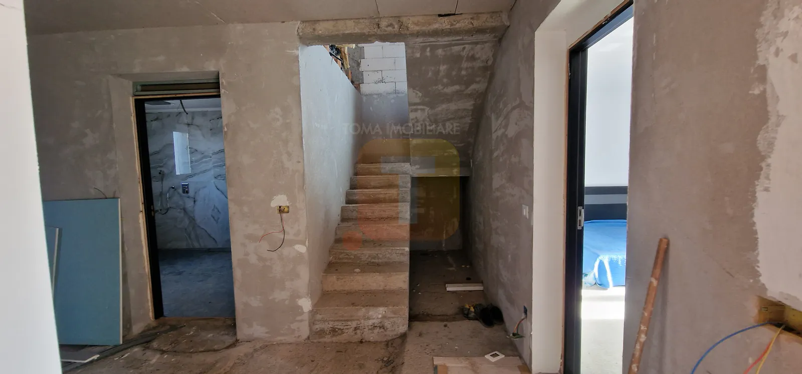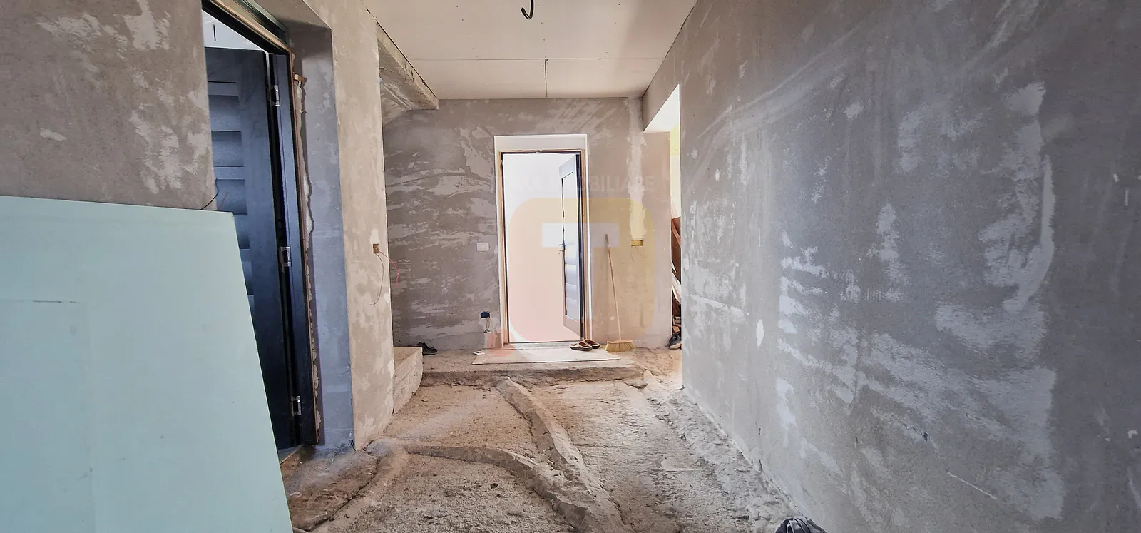 Casa se află în stadiu semifinisat, oferind posibilitatea personalizării spațiului interior.