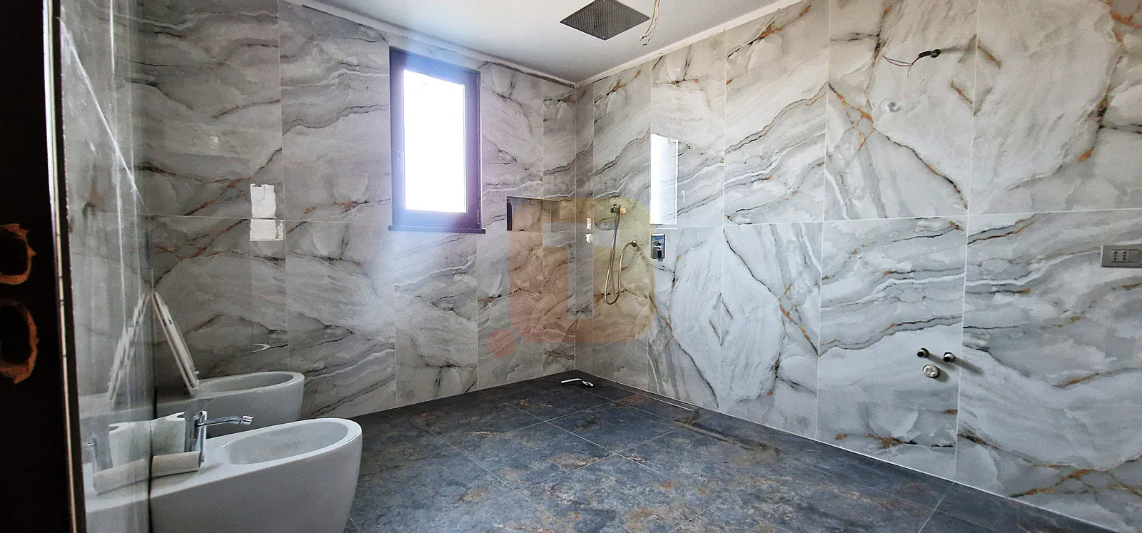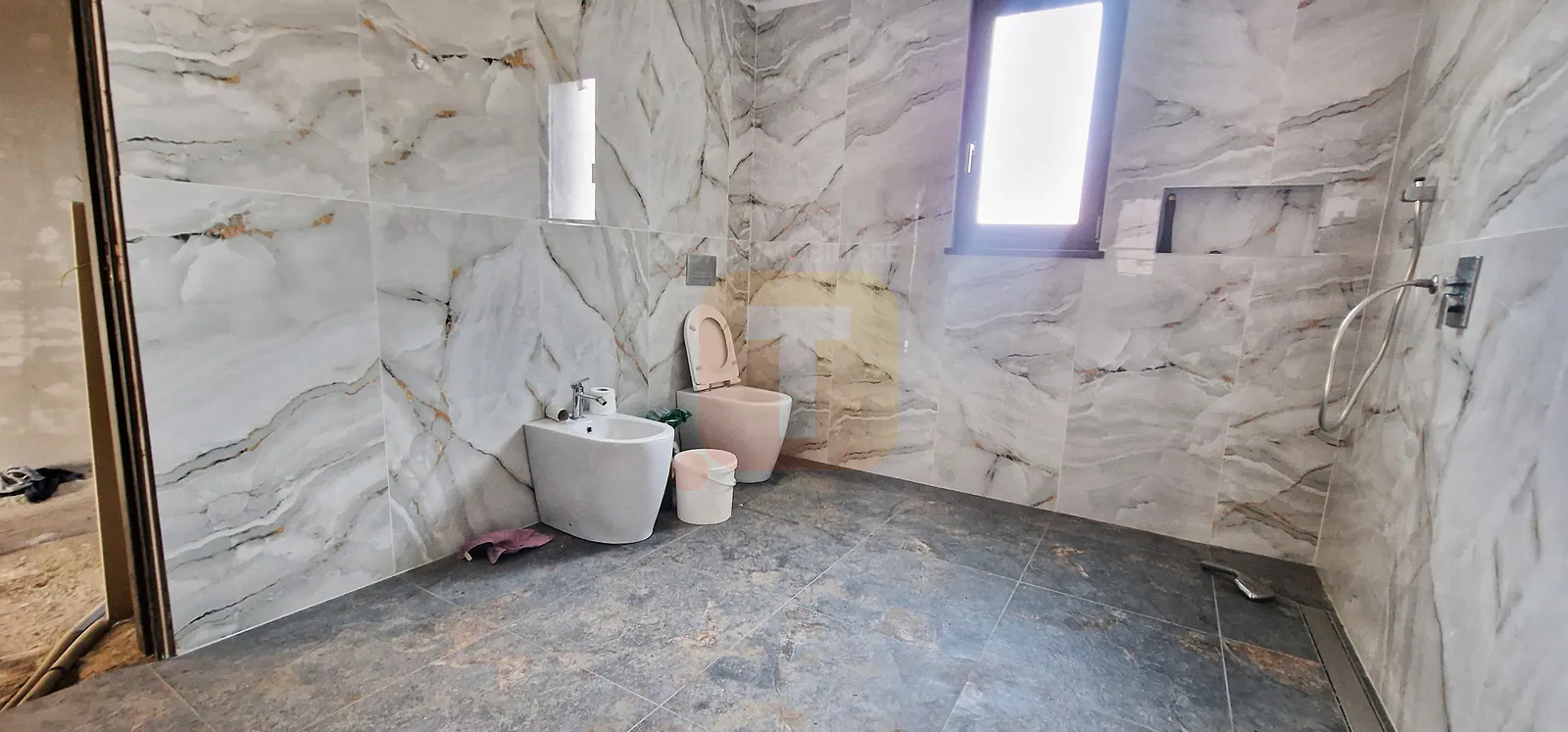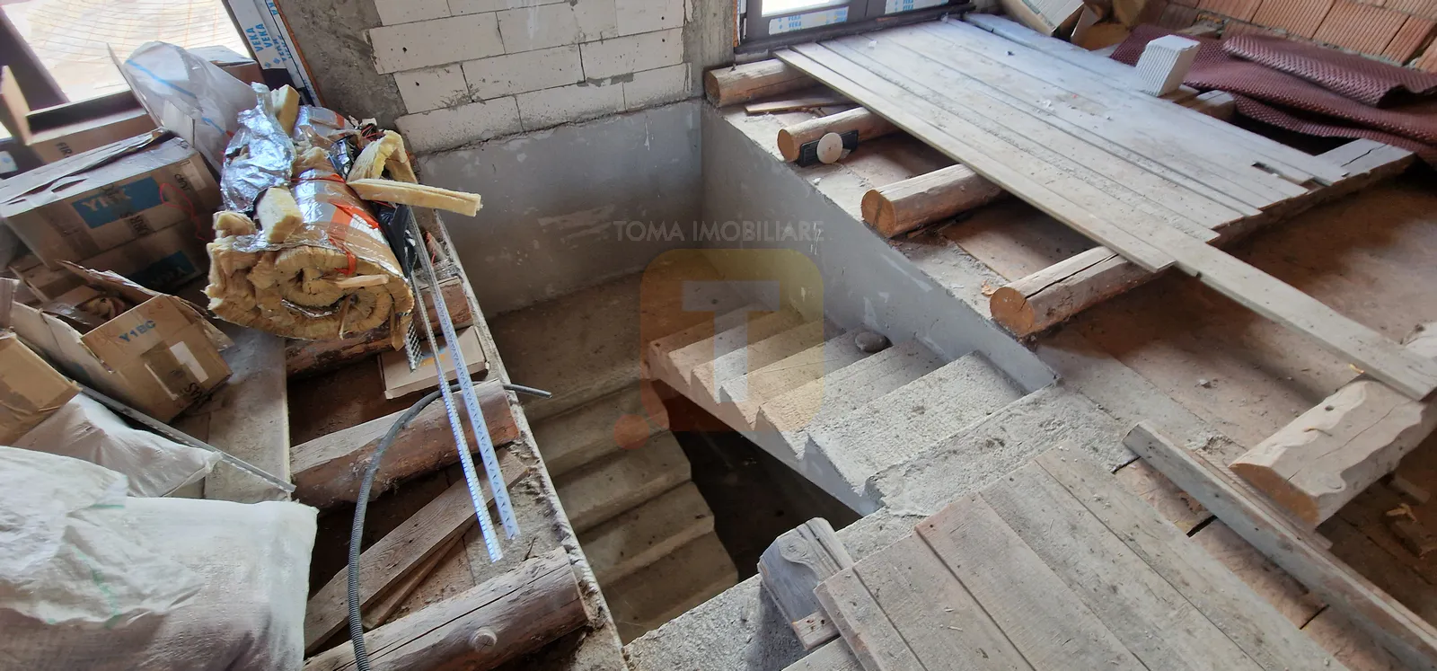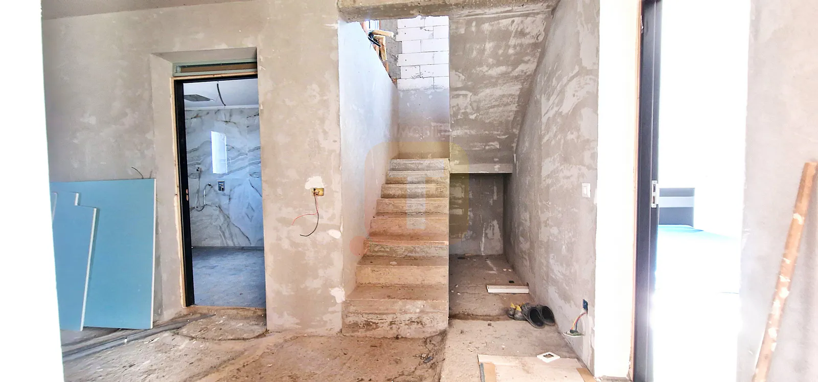 Casa se află în stadiu semifinisat, oferind posibilitatea personalizării spațiului interior.