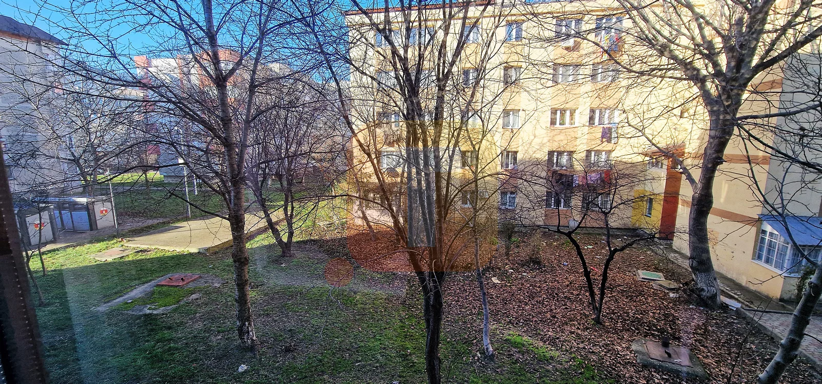 🌿 Priveliște plăcută – grădină cu pomi și verdeață în fața blocului